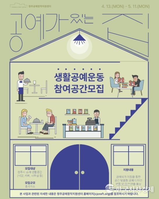 한국시사경제 오영주 기자 | 청주시와 청주시문화산업진흥재단이 운영하는 청주공예창작지원센터는 13일 공고를 시작으로 오는 5월 11일까지 ‘공예가 있는 집’ 프로젝트에 참여할 공간을 모집한다고 밝혔다.
