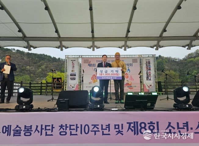 한국시사경제 윤광희 기자 | 진주예술봉사단(단장 최점섭)은 지난 11일, 평거야외무대에서 시민과 함께하는 ‘소년소녀가장돕기 음악회’행사를 개최하고 어려운 이웃돕기 성금 100만 원을 진주시복지재단에 기탁했다.