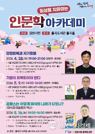 한국시사경제 권충언 기자 | 김천시립율곡도서관(관장 이신기)은 시민들의 정서적 회복과 인문학적 소양 함양을 위해 오는 4월 28일부터 '일상을 치유하는 인문학 아카데미'를 운영하고 참가자를 모집한다고 밝혔다.