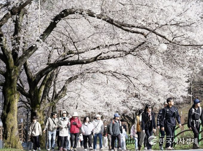 진안군은 평균 해발고도가 약 350m인 고지대로 인해 늦은 벚꽃으로 마지막까지 봄을 담고 싶어 하는 관광객들로 붐빈다.