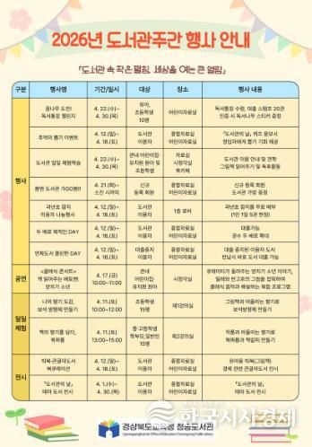 한국시사경제 경북취재본부 | 경상북도교육청 청송도서관이 2026년 4월 도서관주간을 맞이하여 ‘도서관 속 작은 펼침, 세상을 여는 큰 열림’을 주제로 다양한 독서·문화 프로그램을 운영한다.