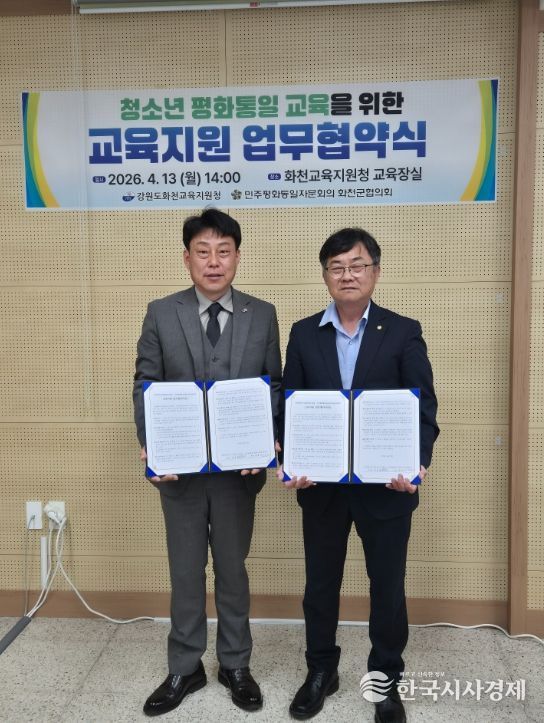 한국시사경제 문화팀 | 강원특별자치도화천교육지원청은 4월 13일 화천교육지원청 교육장실에서 민주평화통일자문회의 화천군협의회와 청소년 평화통일교육을 위한 교육지원 업무협약을 체결했다.