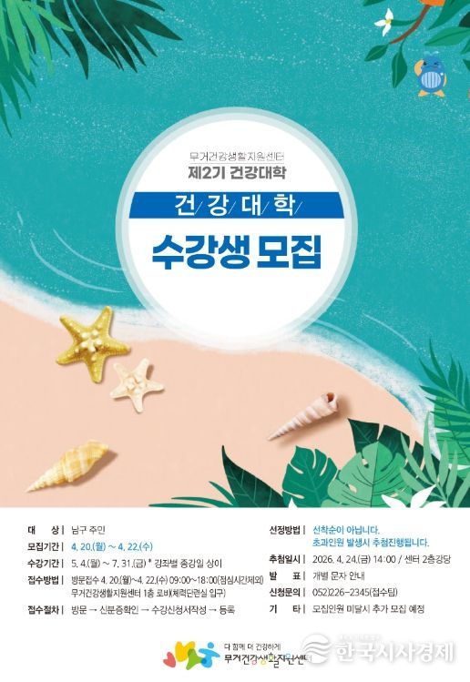 한국시사경제 울산취재본부 | 무거건강생활지원센터는 지역주민의 건강증진을 위한 ‘2026년 제2기 건강대학’ 수강생을 오는 20일부터 22일까지 모집한다고 14일 밝혔다.