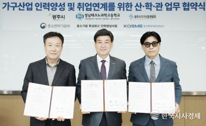 한국시사경제 기동취재팀 | 광주시는 지난 13일 초월읍 숯골길 56에 위치한 광주시 가구소공인센터에서 (사)광주시가구산업연합회, 성남테크노과학고등학교와 가구산업 인력 양성 및 취업 연계를 위한 산·관·학 업무협약을 체결했다.