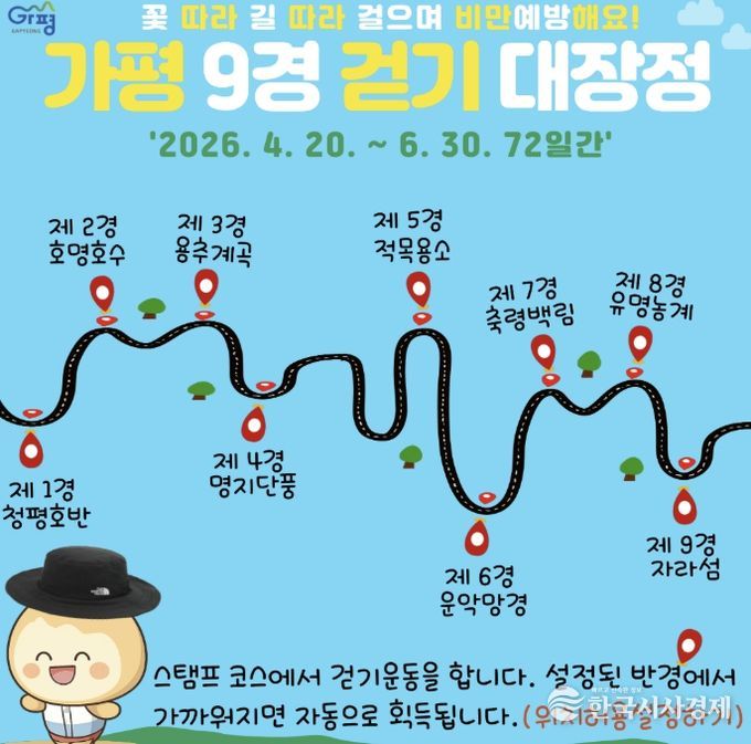 한국시사경제 경기북부취재본부 | 가평군의 수려한 자연경관을 배경으로 건강을 다지는 ‘2026 가평 9경 걷기 대장정’이 오는 20일부터 시작된다. 가평군보건소는 군민들의 비만을 예방하고 걷기 실천율을 높이기 위해 이번 프로그램을 마련했다고 15일 밝혔다.