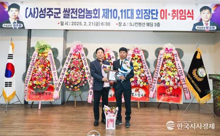 한국시사경제 권충언 기자 | 성주군 쌀 전업농회는 2월 21일 오후 18시 30분 SJ컨벤션에서 회원 및 내빈 80여명이 참석한 가운데 제10·11대 회장단 이·취임식을 개최했다.
