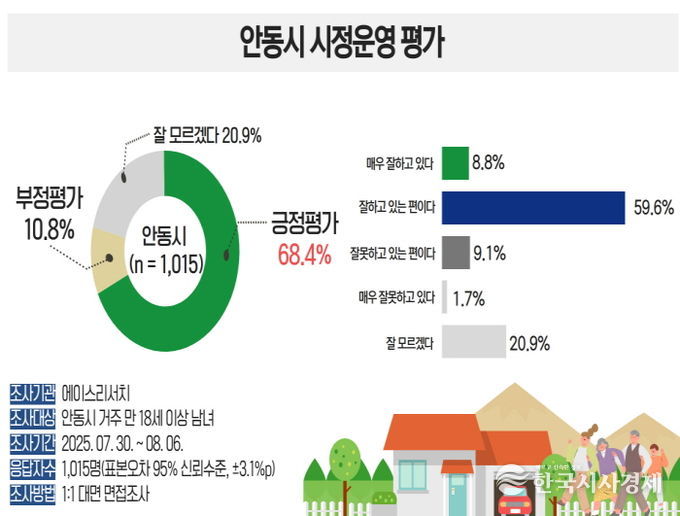 한국시사경제 경북취재본부 | 안동시가 민선 8기 3년 차를 맞아 실시한 '2025년 시정 만족도 및 행정수요 조사' 결과, 시민 10명 중 9명이 안동을 ‘살기 좋은 도시’로 평가한 것으로 나타났다. 전문조사기관 ㈜에이스리서치가 7월 30일부터 8월 6일까지 만 18세 이상 시민 1,015명을 대상으로 1대1 면접 조사를 진행했으며, 표본오차는 95% 신뢰수준에 ±3.1%포인트다.