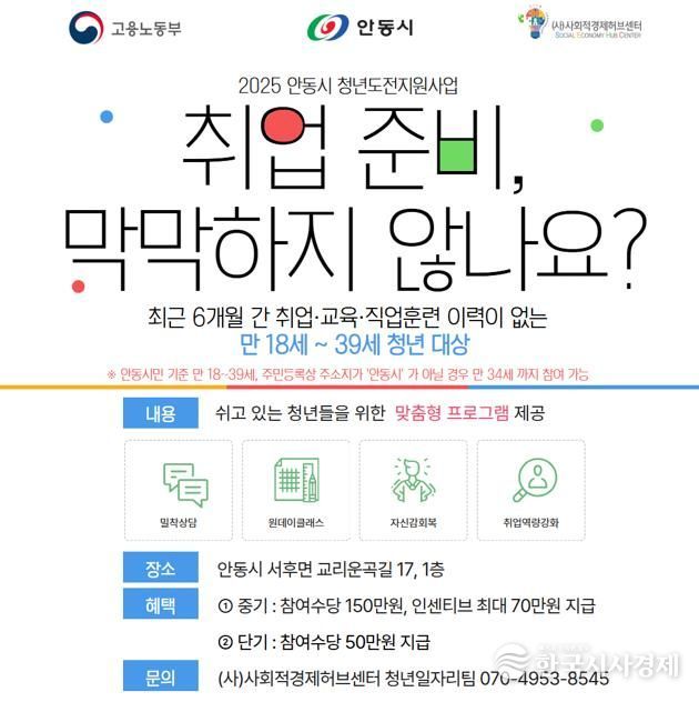 한국시사경제 경북취재본부 | 안동시는 고용노동부 공모사업에 선정돼 올해 상반기부터 시행 중인 ‘청년도전지원사업’을 하반기에도 이어가며, 새로운 참가자를 모집한다.