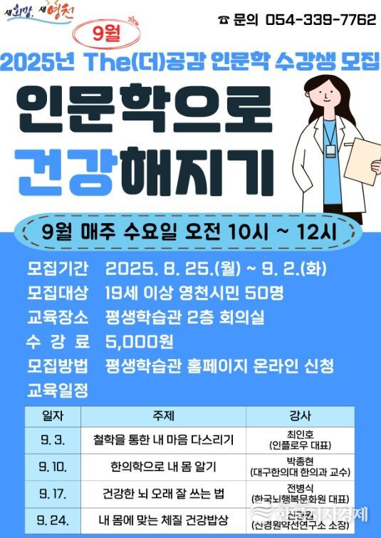 한국시사경제 경북취재본부 | 영천시 평생학습관은 ‘2025년 하반기 The(더) 공감 인문학 특강’ 9월 수강생을 8월 25일부터 9월 2일까지 모집한다고 밝혔다.