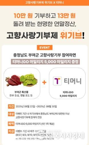 한국시사경제 김태훈 기자 | 부여군은 모빌리티 플랫폼 티머니(Tmoney)GO와 고향사랑기부제 민간 플랫폼 위기브(wegive)가 함께 8월 22일부터 9월 30일까지 특별 제휴 이벤트를 진행한다고 밝혔다.