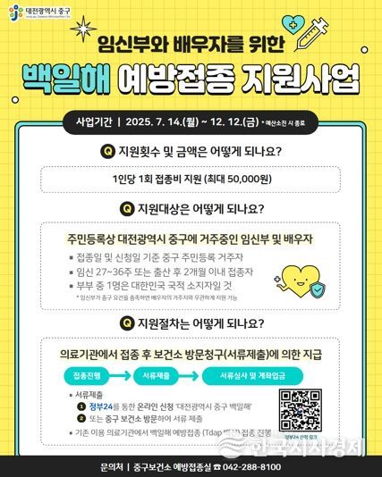 한국시사경제 대전취재본부 | 대전 중구는 출산 장려를 위해 추진 중인 임신부 및 배우자 백일해 예방 접종비 지원사업 신청을 ‘정부24’와 연계하여 온라인에서도 가능하도록 확대했다고 22일 밝혔다.
