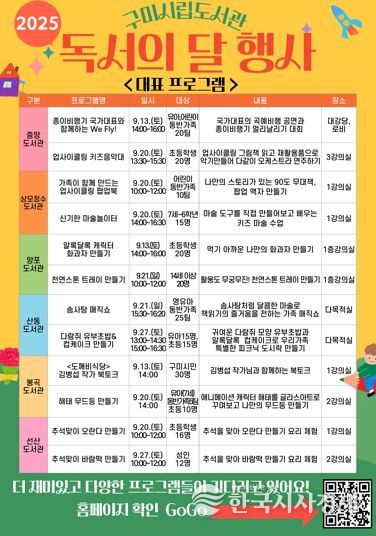 한국시사경제 경북취재본부 | 구미시는 9월 독서의 달을 맞아 시립도서관 6개관에서 작가 북토크, 종이비행기 공연, 솜사탕 매직쇼, 키즈마술, 뽑기 이벤트 등 다채로운 독서문화 행사를 개최한다.