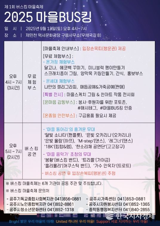 주민이 주체가 되어 일상 속 문화 향유 기회를 넓히고, 세대와 이웃이 어울리는 공동체 문화를 확산하기 위해 열리는 이번 축제는 오는 9월 13일 오후 4시부터 7시까지 제민천 역사문화광장(구 읍사무소) 일원에서 개최된다.