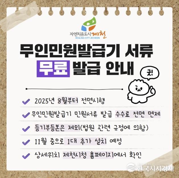 한국시사경제 충북취재본부 | 제천시는 지난 8월 8일 '제천시 각종 증명 등 수수료 징수 조례'를 개정·공포하고, 관내 무인민원발급기의 민원서류 발급 수수료를 전면 면제하기로 했다.
