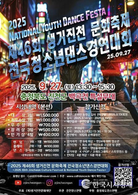 한국시사경제 김태훈 기자 | 충북 진천군 (재)생거진천문화재단은 오는 9월 27일 제46회 생거진천 문화축제를 맞아‘전국 청소년 댄스 경연대회’를 백곡천 메인 무대에서 개최한다고 27일 밝혔다.