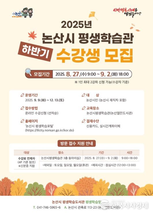 한국시사경제 김태훈 기자 | 논산시는 오는 8월 27일부터 9월 2일까지 ‘2025년 논산시 평생학습관 하반기 정규 프로그램’ 수강생을 선착순으로 모집한다.