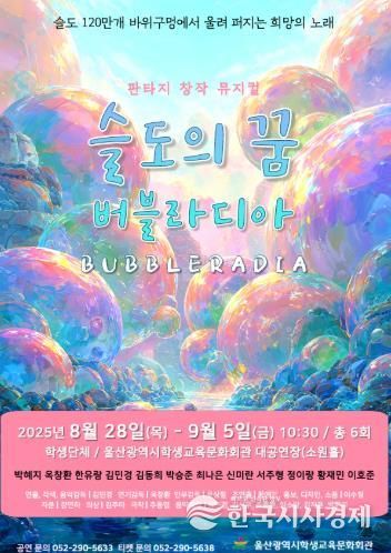 한국시사경제 울산취재본부 | 울산광역시학생교육문화회관은 오는 28일부터 9월 5일까지 대공연장 소원홀에서 유치원 원아와 초등학교 1~4학년 단체를 대상으로 창작 뮤지컬 ‘슬도의 꿈 버블라디아’를 공연한다.
