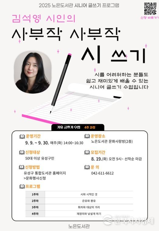 한국시사경제 대전취재본부 | 대전 유성구는 9월 독서의 달을 맞아 노은도서관에서 시니어를 위한 글쓰기 프로그램 ‘김석영 시인의 사부작 사부작 시 쓰기’를 운영한다.