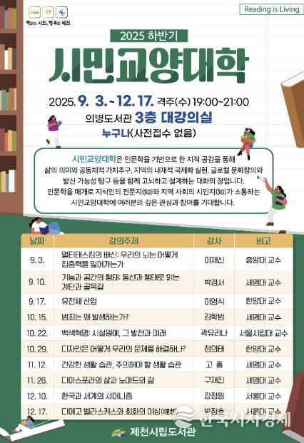 한국시사경제 충북취재본부 | 제천시립도서관은 오는 9월 3일부터 12월 17일까지 의병도서관 3층 대강의실에서 제천 시민을 대상으로 ‘2025년 하반기 시민교양대학’을 운영한다.