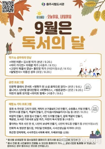 한국시사경제 충북취재본부 | 충주시립도서관에서 9월 독서의 달을 맞아 시민들에게 문화 향유 기회를 제공하고 독서의 즐거움을 알리기 위한 다채로운 독서문화 프로그램을 운영한다.