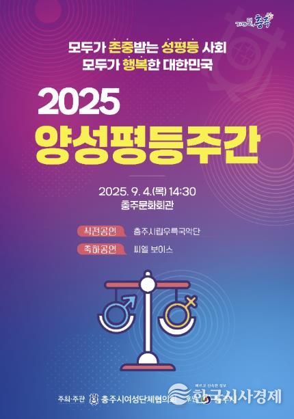 양성평등문화제 미술·공예 공모전 입상 작품 전시회는 9월 2일부터 4일까지 충주시 문화회관 전시실에서 개최되며, 양성평등주간 기념식은 9월 4일 오후 2시 30분 충주시 문화회관 대강당에서 개최된다.