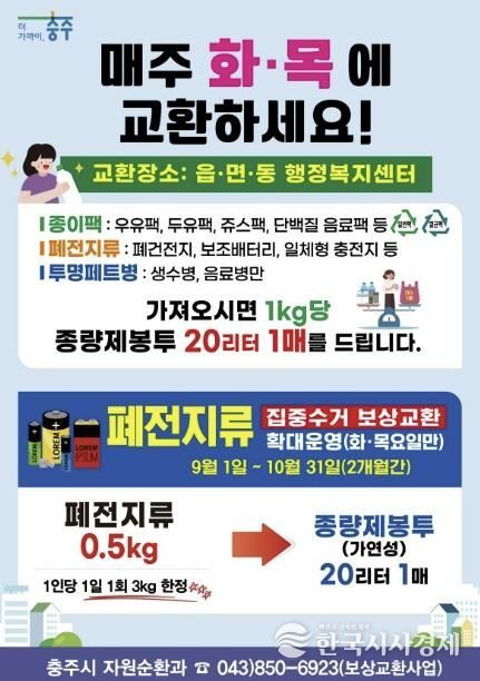 한국시사경제 충북취재본부 | 충주시는 방치된 폐전지류의 위험사고를 예방하고 원활한 재활용을 위해 읍면동 마을회관 등에 폐전지류 수거 전용 마대를 보급했으며, 10월 31일까지 ‘폐전지류 집중 수거 기간’을 운영한다고 밝혔다.