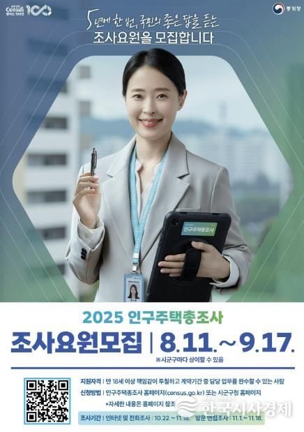 접수는 내달 17일까지 인구주택총조사 누리집 또는 홍성군청 기획감사담당관 법무규제개혁팀으로 방문접수 가능하며, 합격자는 9월 24일 개별문자로 발표 예정이다.