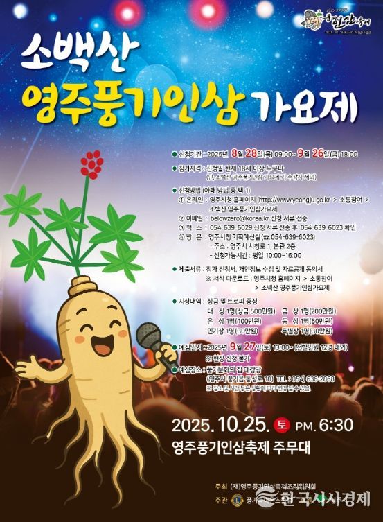 이창구 영주풍기인삼축제조직위원장은 “2025 영주 소백산풍기인삼가요제는 축제장을 찾는 지역 주민과 관광객 모두가 행복한 추억을 남길 수 있는 행사”라며, “실력 있는 예비 가수들이 많이 참여해 최고의 무대를 장식해주길 바란다”고 말했다.