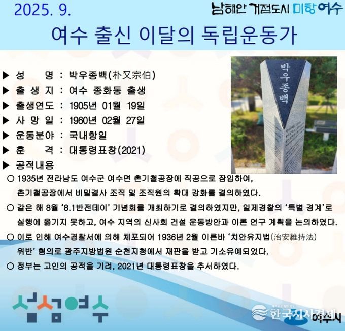 한국시사경제 전남취재본부 | 여수시는 전라남도 여수 종화동 출신의 ‘박우종백(朴又宗伯)’ 선생을 2025년 9월의 독립운동가로 선정했다.