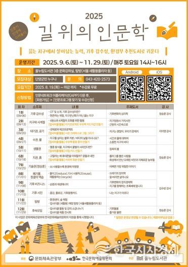 신명희 도서관장은 “지난겨울의 폭설, 봄철 산불, 한여름 폭염까지 주민 모두가 기후변화를 체감한 만큼, 이번 인문학 프로그램이 기후 감수성을 키우고 환경문제에 대해 함께 고찰하는 소중한 계기가 되길 바란다”고 말했다.