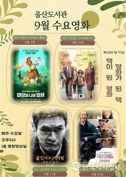 한국시사경제 울산취재본부 | 울산도서관은 9월 ‘독서의 달’을 맞아 매주 수요일 오후 3시 울산도서관 1층 종합영상실에서 책과 영화가 만나는 특별한 시간을 마련한다.