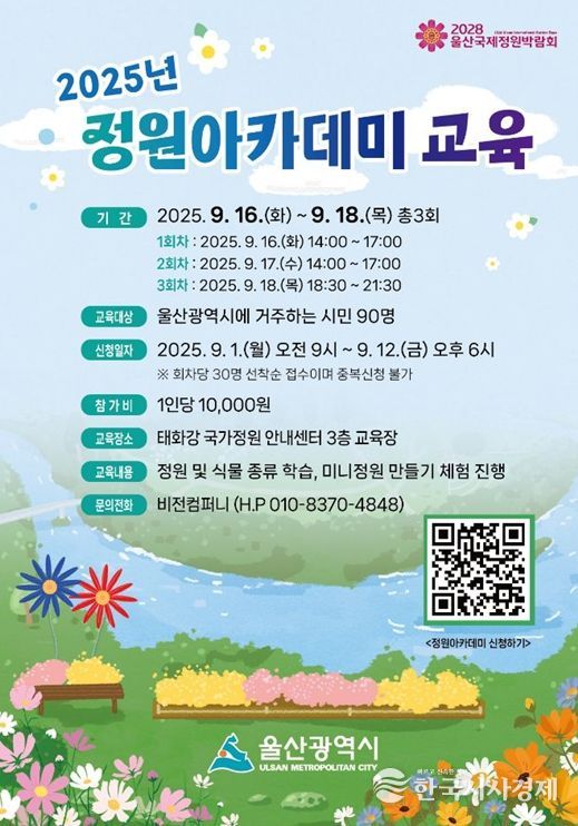 한국시사경제 울산취재본부 | 울산시는 오는 9월 16일부터 18일까지 3일간 운영되는‘정원아카데미’교육에 참여할 시민 90명을 모집한다고 밝혔다.