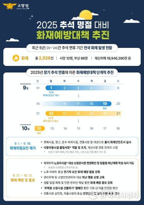한국시사경제 오영주 기자 | 소방청은 9월 1일부터 10월 12일까지 약 6주간 ‘추석 명절 대비 화재예방대책’을 집중 추진한다고 26일 밝혔다. 긴 연휴 동안 늘어나는 이동과 다중이용시설 이용으로 화재 위험이 높아지는 만큼, 화재를 예방하고 인명 및 재산 피해를 최소화하기 위한 종합 대책이다.