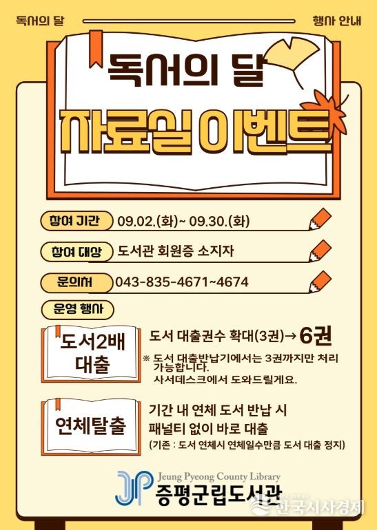 한국시사경제 충북취재본부 | 충북 증평군은 9월 독서의 달을 맞아 2일부터 30일까지 군립도서관과 공립작은도서관에서 독서 진흥 이벤트를 운영한다고 밝혔다.
