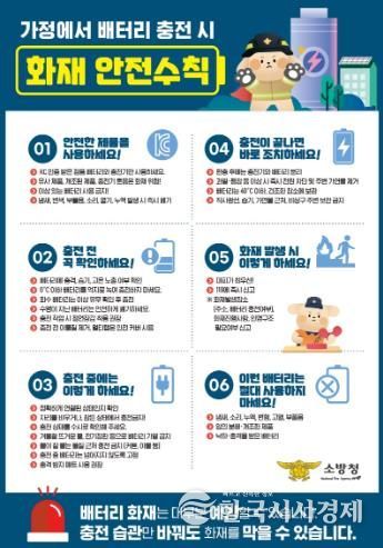 이에 소방서는 시민들이 일상에서 반드시 지켜야 할 가정 내 배터리 충전 안전수칙으로 ▲KC인증 정품 배터리와 충전기 사용 ▲충전 전 이상 여부 확인 ▲자리 이탈 또는 수면 상태에서의 충전 금지 ▲충전 완료 후 배터리와 충전기를 즉시 분리 ▲화재 시 대피를 최우선으로 하고 즉시 119 신고 ▲낙하 또는 충격, 냄새ㆍ소리ㆍ누액ㆍ팽창 등 이상 징후가 있는 배터리 사용 금지 등을 안내하고 있다.