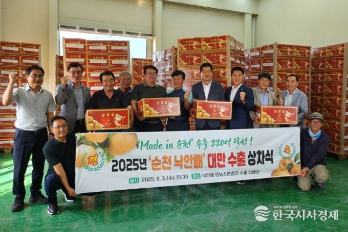 한국시사경제 전남취재본부 | 순천시는 3일 낙안배영농조합법인수출선별장에서 ‘2025년 순천 명품 낙안배 대만 수출 기념 상차식’을 개최했다고 밝혔다.
