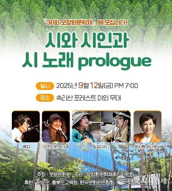 보은군에 따르면 ‘30회 오장환 문학제’ 개막일인 오는 12일 오후 7시 보은군 속리산포레스트에서 ‘시와 시인과 시 노래 prologue’를 펼친다. 이번 문학제 행사의 하나로 시인들과 시 노래 가수들이 꾸미는 콘서트다.