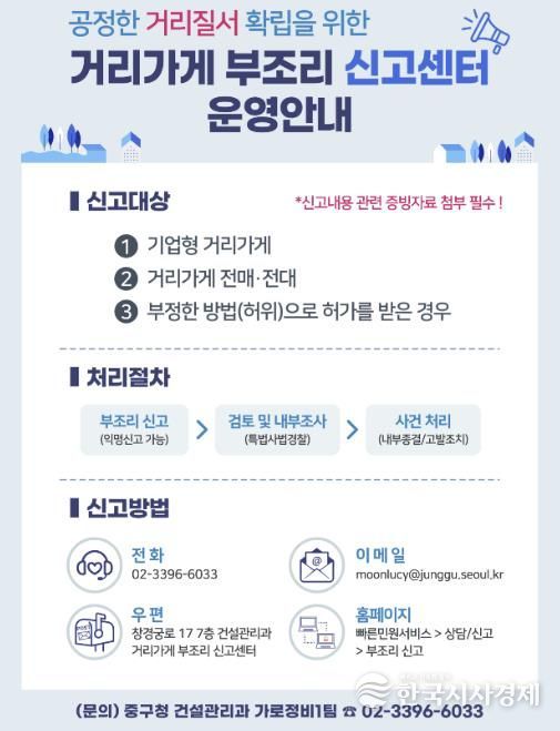 중구는‘K-관광 1번지’의 명성을 지키기 위해‘거리가게 운영 부조리 신고 창구’를 개설하고, 불법·부정 행위를 집중 단속한다고 밝혔다.