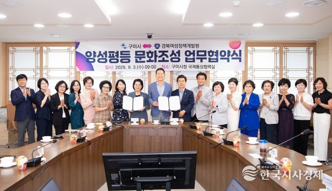 한국시사경제 경북취재본부 | 구미시는 지난 3일 시청 국제통상협력실에서 경북여성정책개발원(원장 하금숙)과 ‘양성평등한 지역사회 환경 조성’을 위한 업무협약을 체결했다.