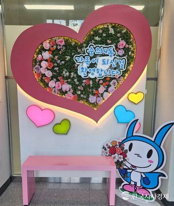 포토 존은 하트 모양의 패널에 엘이디(LED) 조명이 어우러진 디자인으로, ‘숭의4동 가족이 되신 걸 환영합니다’라는 문구와 꽃장식이 함께 배치돼 따뜻하고 깔끔한 분위기를 자아낸다.