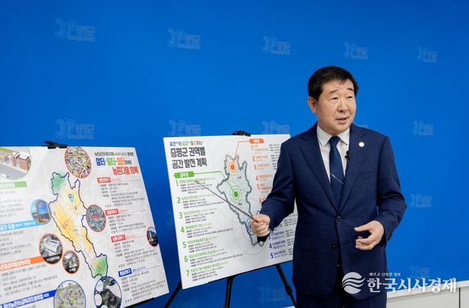 이재영 군수는 4일 군청 브리핑실에서 기자회견을 열고 “권역별 맞춤형 재구조화와 핵심 거점 조성을 통해 주거·문화·산업·돌봄이 어우러진 증평형 농촌모델을 완성하겠다”고 밝혔다.