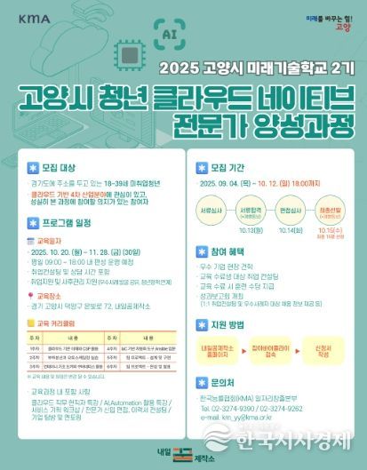 한국시사경제 경기북부취재본부 | 고양특례시는 청년들의 미래 산업 경쟁력 강화를 위해 오는 10월 20일부터 11월 28일까지 ‘2025년 고양시 미래기술학교 2기 - 청년 클라우드네이티브 전문가 양성과정’을 운영한다고 밝혔다.
