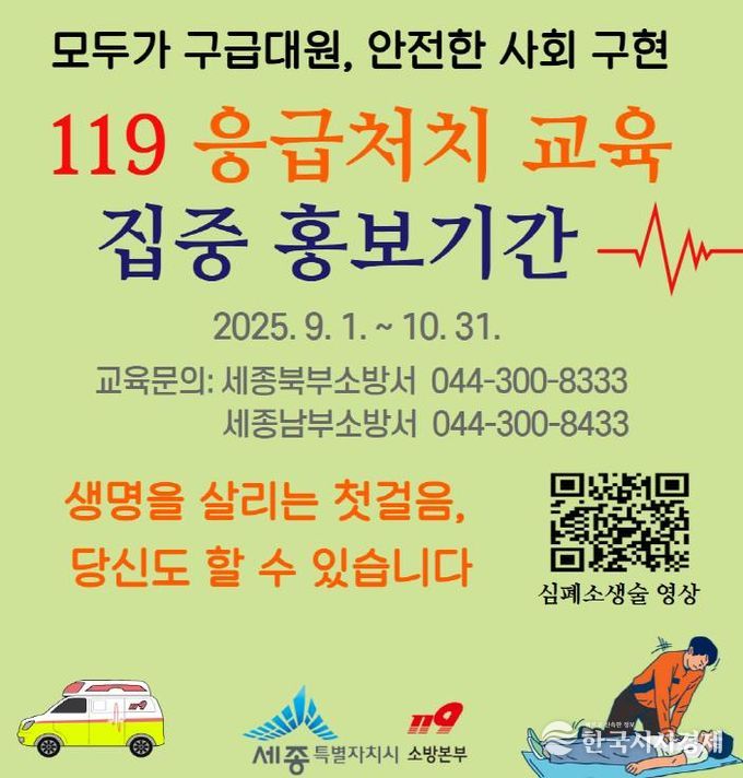 한국시사경제 오영주 기자 | 세종소방본부가 오는 10월 31일까지 시민들의 응급처치 능력을 높이고, 안전문화를 확산하기 위해 119 응급처치 집중 홍보기간을 운영한다.