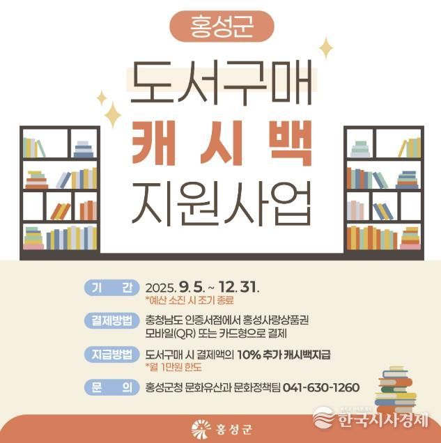 한국시사경제 김태훈 기자 | 홍성군은 도서구매를 통해 지역 주민의 독서문화를 확산시키고 지역 경제 활성화를 목표로, '홍성군 충남 인증서점 도서구매 캐시백 지원사업'을 5일부터 본격 추진한다고 밝혔다.