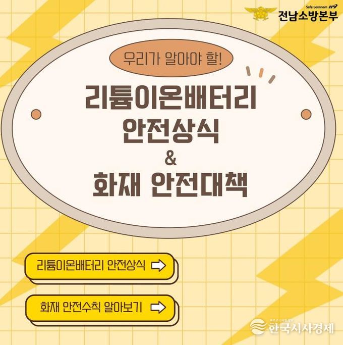 여수소방서는 배터리 화재 예방을 위해 ▲영하 20℃ 이하 또는 40℃ 이상의 장소 보관 금지 ▲뜨거운 차량 내부나 직사광선, 액체 근처 방치 금지 ▲사용 후에는 반드시 배터리 재활용 수거함에 폐기 ▲이상 징후 발생 시 즉시 사용 중지 및 119 신고 등 안전수칙 준수를 강조하고 있다.