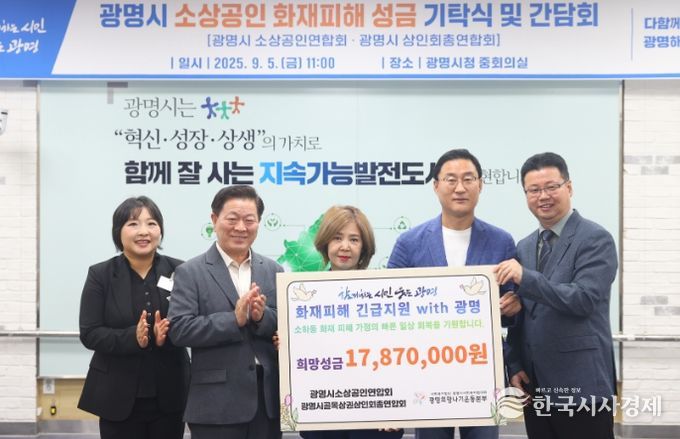 한국시사경제 경기취재본부 | 광명시 소상공인들이 지난 7월 발생한 소하동 아파트 화재로 피해를 입은 주민들을 위해 모은 성금 1천 800여만 원을 기탁했다.