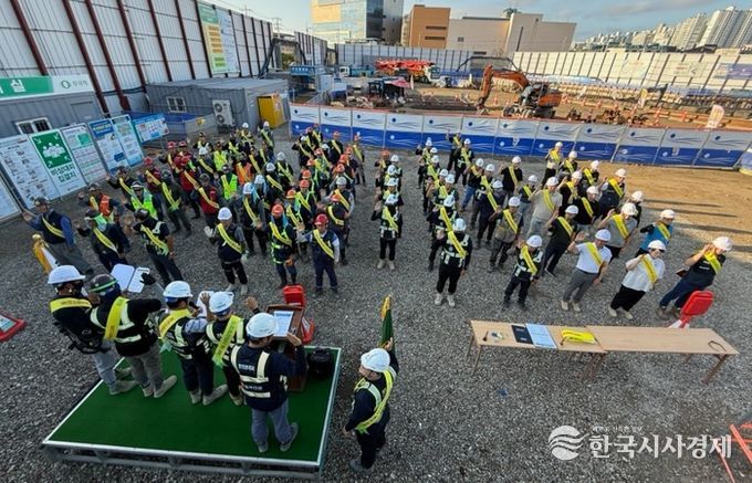 현장에는 컨벤션건립과 직원, 시공사, 감리단 등 80여 명이 함께했으며, 아침 체조를 시작으로 협력사 위험성 평가 발표, 우수 근로자 포상, 안전관리감독자 제도 설명, 안전관리 결의문 낭독 등 다채로운 순서로 진행됐다.