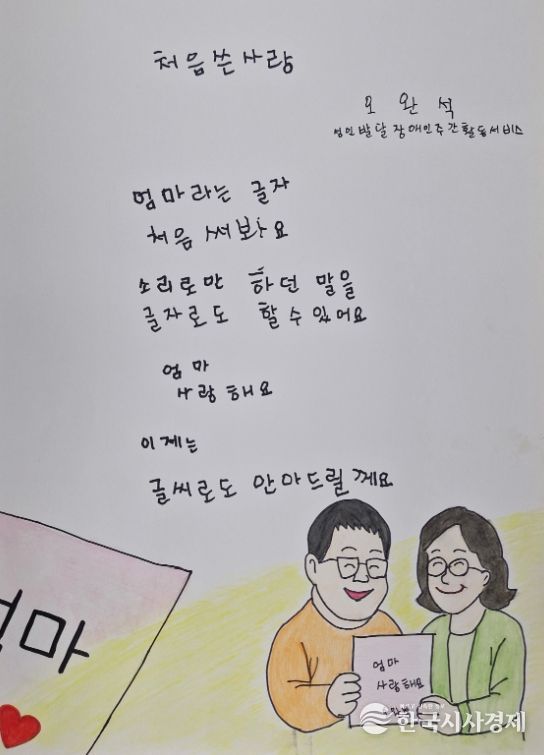 오완석 학습자의 작품 ‘처음 쓴 사랑’은 문해교육을 통해 ‘엄마’라는 단어를 처음 써보며 느낀 그 마음을 표현했고, 그는 “숫자와 글씨, 무엇으로도 엄마를 표현해 보고 싶었다”며 “앞으로 더 많은 단어를 배우고 싶다”는 소감을 전했다.