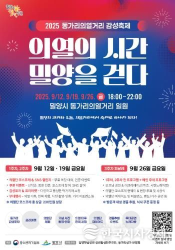 한국시사경제 윤경수 기자 | 경남 밀양시는 오는 12일부터 26일까지 매주 금요일 동가리의열거리 일원에서 ‘2025 동가리의열거리 감성축제’를 개최한다고 8일 밝혔다.