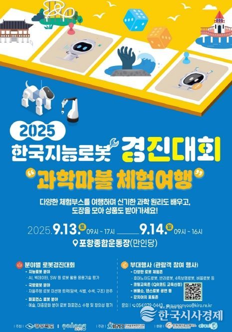 한국시사경제 한장선 객원기자 | 경상북도와 포항시가 주최하고 한국로봇융합연구원이 주관하는 ‘2025 한국지능로봇경진대회’가 오는 13일부터 14일까지 양일간 포항종합운동장 만인당에서 열린다.